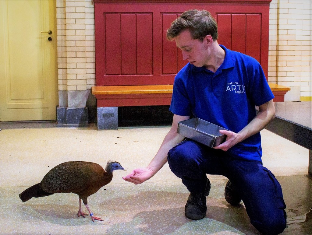 Kevin Varekamp working with an Argus pheasant, at Artis Zoo, Amsterdam.